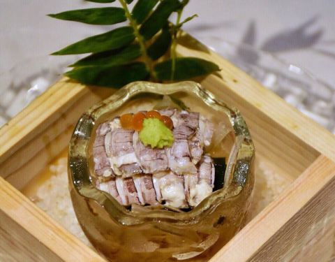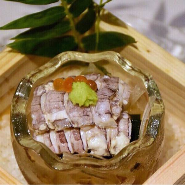|先付^先付是日式料理中的小酒菜,相当于冷菜,一般第一个上,以免客人久候。今天的先付很别致,一个透明的蛋,掀开是虾菇肉,下面是醋腌海带,非常符合我的口味。