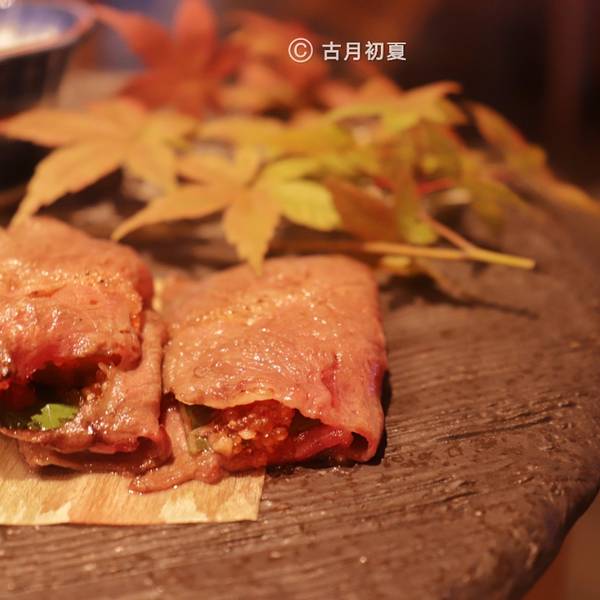 |澳洲和牛薄烧^以顶级澳洲和牛薄片包裹紫苏叶和脆椒炙烤,香嫩可口,汁水丰富,再搭配烤蒜皮和芥末,更加鲜美。