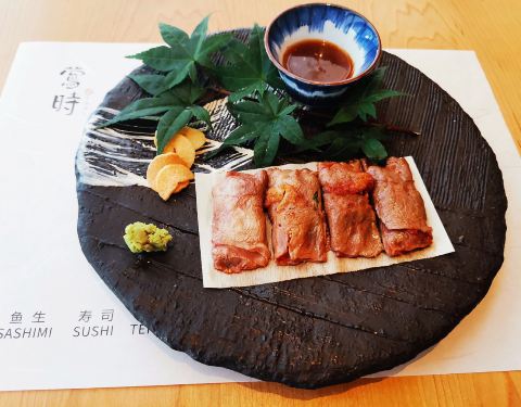 「澳洲和牛薄烧」推荐三分熟和五分熟的口感,牛肉卷里面也是暗藏玄机,搭配了飞鱼籽,享受口中爆汁的感觉!和牛薄烧建议四吃,一吃原味的,二吃可以搭配蒜片,三吃可以加芥末,四吃建议搭酱汁。