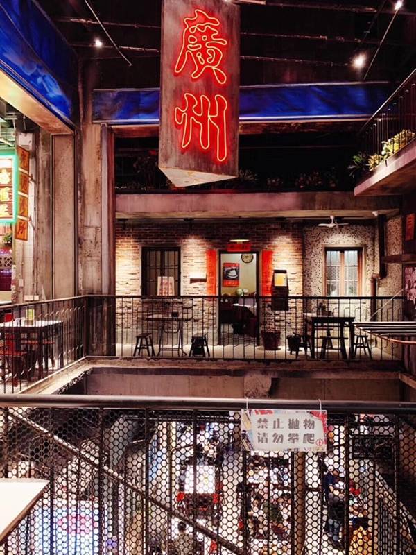 二楼这边就把一些广州的地标搬进去了,比如说高地街啊之类的,跟一楼那边的一些店铺组成的景观又有点不一样,再坐下来之后就会给吃龙虾的手套,还有围巾。