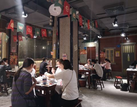 - ...到室内,这边用的都是方形的木桌子,看起来是比较的,古朴一点,有点像是以前坐在大街上吃东西的感觉