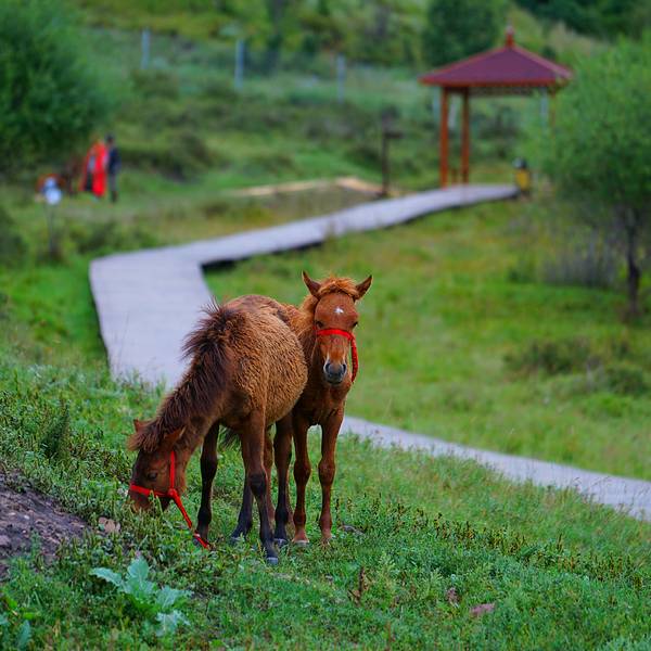 继续往里走是木栈道,会看见高山草甸,茂密的森林森林牧场,漂亮的大孔雀,成群的咩咩羊,悠闲吃草的白骆驼,小马驹。继续往里走是木栈道,会看见高山草甸,茂密的森林。
