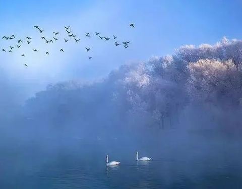 这里生活着一群洁白的精灵,将冬日的寂静勾勒的更为浪漫。成群的天鹅在悠然嬉戏远远望去,仿佛点点白帆。与晨雾、树挂、湖水、构成了一副美丽的画卷,让人误以为掉进了仙境。
