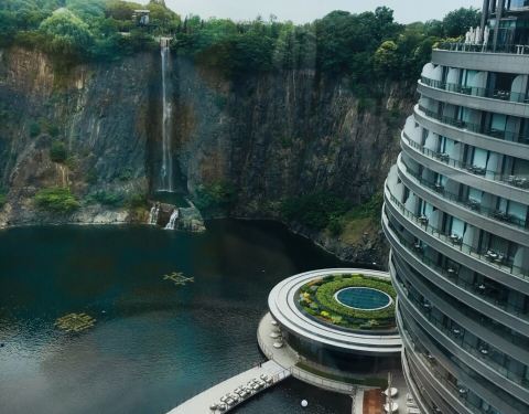 深坑酒店内的粤菜馆,窗外皆是瀑布美景。