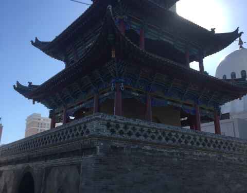 伊犁地区最大的清真寺,建于清乾隆年间,原为汉式建筑风格,后大部分损毁,只留下一座汉式邦克楼,主体建筑为近年重建的白色大理石罩面的阿式建筑,外观很壮观,可惜谢绝参观。
