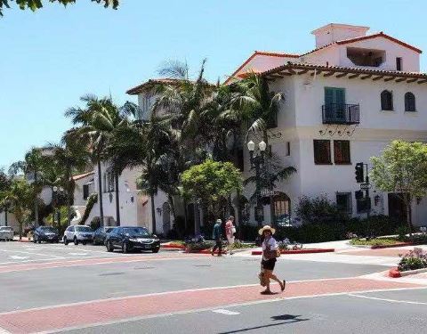 美丽的晴朗天气,西班牙建筑,棕榈树...3个多小时,我觉得我不是在美国,而是在安大路西亚的某个地方。州立大街是圣塔芭芭拉的主大街,林立着商店、百货大楼、咖啡馆和餐馆。气氛非常放松。整个区域是在1925年地...