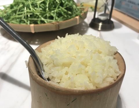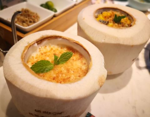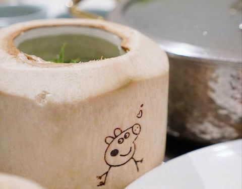 朋友说想吃火锅,养生一点的那种,于是就来到了这家看起来很清淡的火锅店。装修是ins风的小清新,座位之间的间隔很大,很宽敞的布局令人舒服。先是3只叶青的汁煮沸,放入鸡腿肉烧3分钟即可食用。鸡肉很嫩,不蘸酱也很好吃,原味甜甜的带着椰香。牛肉和鲷鱼质量都挺不错,食材新鲜,牛肉下面还铺垫着满满的蔬菜。油鸡饭偏淡,但是挺香的,忍不住倒了一点酱料吃,很美味。由于等位超过40分钟还送了个椰子冻(好好吃!),但是吃完其他的让服务员上这个等了好久,其他都还比较满意。