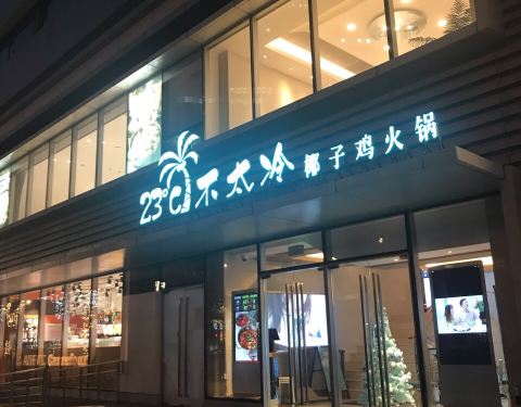 23度是海南文昌的年平均温度,所以她家取名为23度不太冷。主要吃椰子鸡火锅。 买了个双人套餐团购,还是蛮划算的。锅底是椰子鸡,里面有椰肉,服务员会把椰子汁当场倒入锅中。煮开了之后加入鸡块,煮三分钟即可食用。鸡汤因为加入椰汁所以好甜。鸡还是蛮嫩的。套餐还有一大盆蔬菜,她家蔬菜倒是真的嫩。 餐厅环境蛮赞的,天花板装饰很现代。