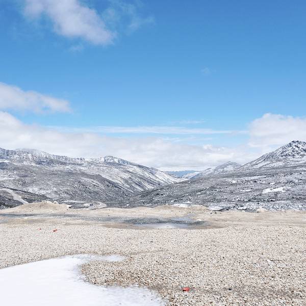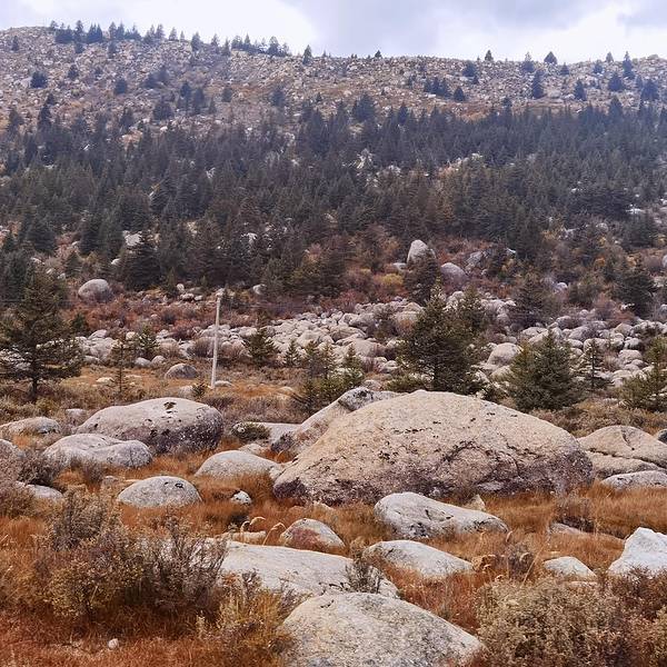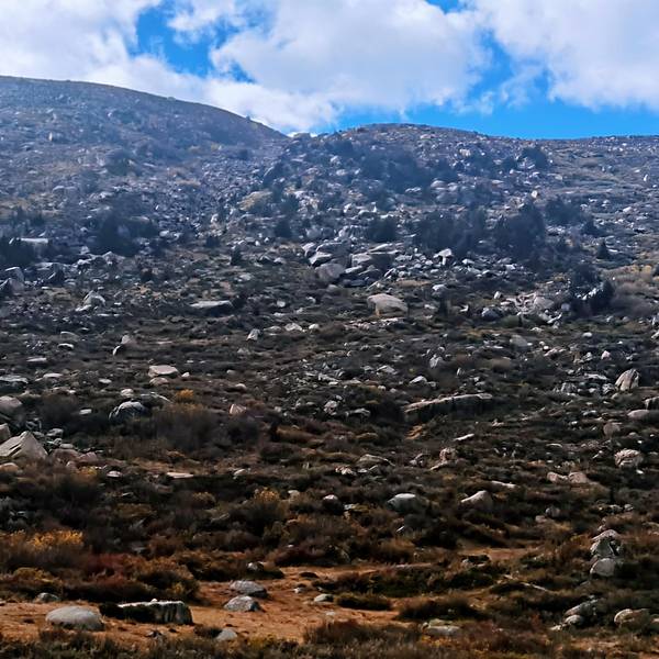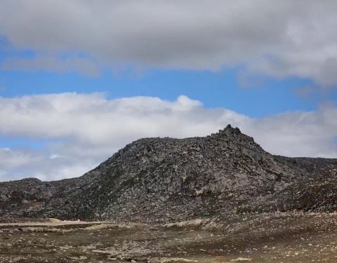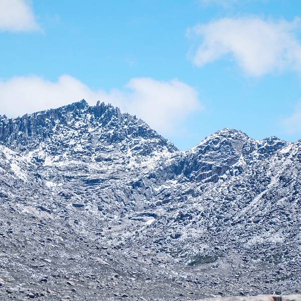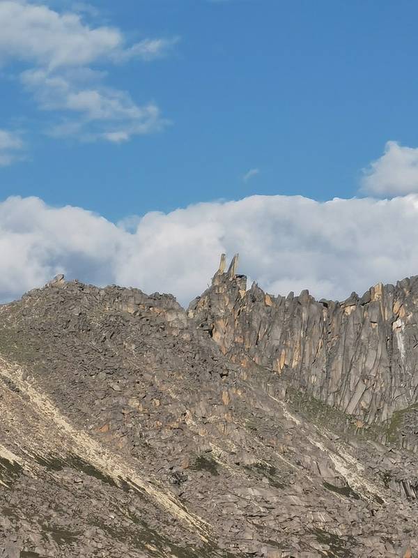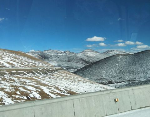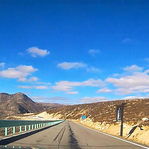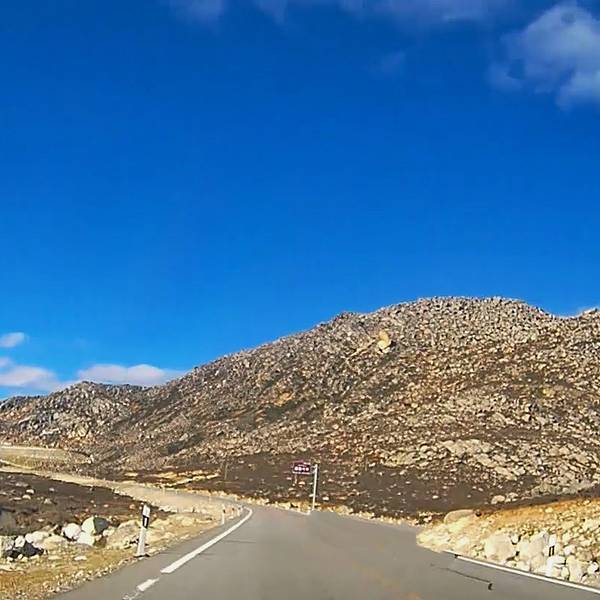 几十公里后,海拔开始大幅提高,进入到平均海拔4500米的海子山地区。沿路景色发生了明显变化,山上的树木草甸逐渐被石块覆盖,碎石堆积的山体光禿禿的,行驶此地顿有荒凉之感。首先进入眼帘的为兔儿山。