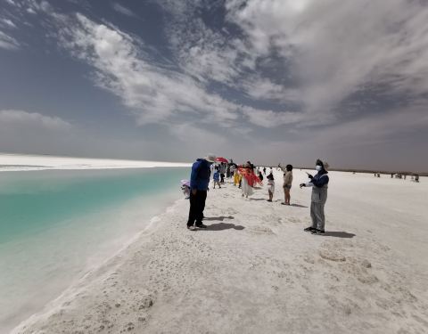 湖的颜色与青海湖不同,由于含铜量较高湖水呈现出鲜绿色,岸边尽是覆盖着的白色结晶。
