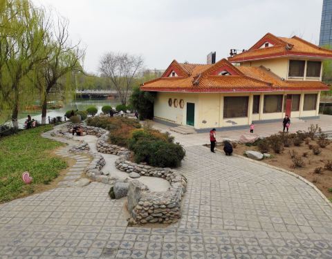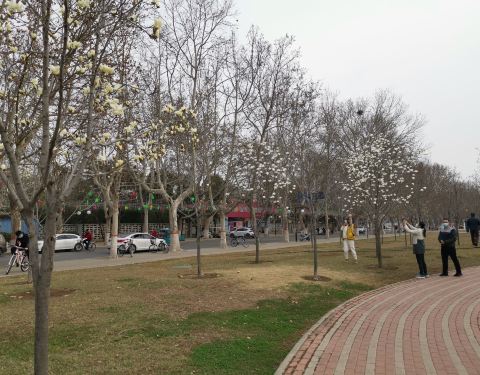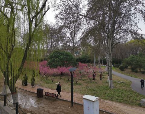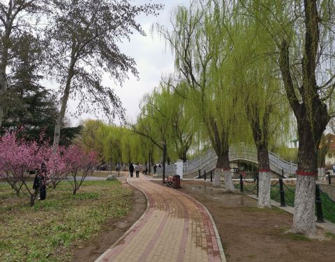 正值花开时节的季节,步入园中,满园的春色映入眼中,园中柳树成荫,花朵迷人,还有小河流水,小山丘等;园中还有健康跑道、休息长椅、健身器材,还有就是可以放风筝!!是休闲的好去处!