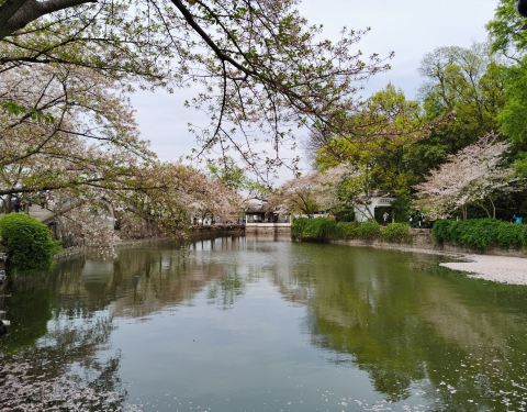 刚进来就一直想看这个景点,走到最后才看到,这里樱花真的超级的美,配合上一个建筑,而且旁边还有长春桥,水池里面下满了樱花的花瓣。无论从任何角度都是一张美景。