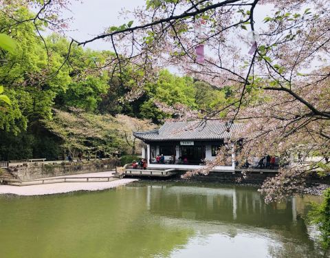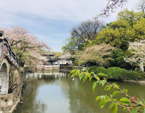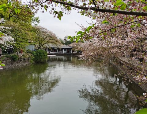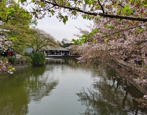 很好的拍樱花的一个点,最好的背景就是那几栋有点日式风格的楼,和环着池塘的樱花形成了很好的呼应,...