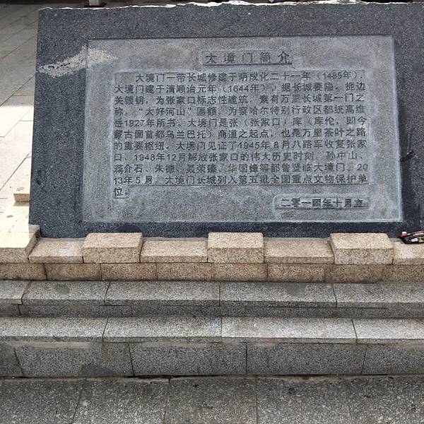 参考当地人的介绍,下午来到市区附近的景点转转。 大境门自古是扼守京都的大门,连接边寨与内地的交通要道,为兵家必争之地。 现为4A级景区,距今有500多年历史,来张家口要到这里看看。门额是察哈尔都统高维岳所书“大好河山”一行人都畏惧爬山,看着陡峭的长城,都果断选择放弃,在周边转转