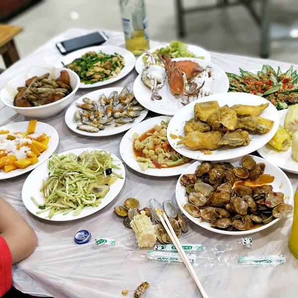 这次我们住在首钢疗养院附近的海潮农家院,我表姑推荐的,比上一次止锚湾那家好一些。 人均消费150元,包吃住。 从海潮农家院出来走5分钟左右,过一条马路再走5分钟左右就到海边了。早餐:玉米面粥,煮鸡蛋,炸花生米,三盘咸菜 (海带丝,黄瓜拌凉皮,芥菜丝) 午餐:时间原因,没吃到。 晚餐:如图。 PS:感觉农家院的海鲜也就这些便宜的贝类,没有虾,不过想吃什么样的海鲜可以自己买让他们给加工。吃饭之前,咱仨干一个🍻… PS:酒水是需要额外付钱的哦!
