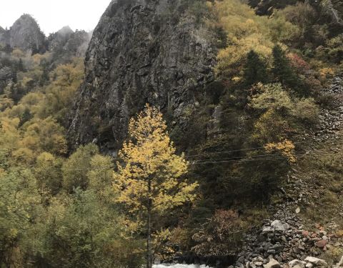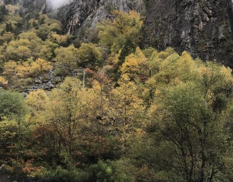 牦牛谷被称作是天然盆景区。山谷中两岸是高山,一边是河流,欢快的伴着汽车跳跃前行。山上的叶子露黄了有的也泛红了,山顶云雾缭绕,时而在山腰,时而在山顶,非常感谢梦幻。