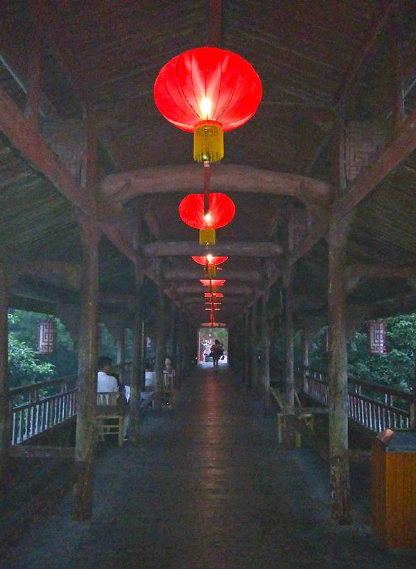 #点评召集令# 永康西津桥 永康西津桥,是一座始建于清代的石桥墩木结构重檐廊桥,特点就是非常长,有166米长。南北走向,横跨于永康江之上。现为浙江省文物保护单位。整座桥给人的感觉很漂亮,桥中间有亭阁,两侧还是重檐。桥两边有木壁窗棂,凭栏眺望,风光无限。桥柱间设的桥凳,还特别摆放了一些桌椅,许多行人在此休息,韵味独特,成了当地人闲坐聊天的好去处。当时让我感觉特别有意境, 也找个桥凳休息赏景,看着宽宽的河面,平静的流水,桥上行走的行人,很是惬意。 坐够了,感觉肚子饿了,桥头找到一家“吴家灯笼馄饨”的馄饨与缙云桶饼,感觉挺好吃的。这里天全黑下来了,很想再看看大桥的灯光。雨一直在下,问了几个人都说天黑后桥上会亮灯,时间说法不一。附近吃了晚饭回来约6:30左右,果然亮灯了。长长的廊桥檐下一排红灯笼,煞是好看。只是没有脚架,照片是无法拍好滴,欣赏吧,用眼用心来欣赏,不一定非要拍片片。实用攻略: 门票:无 交通: 可乘坐永康市内公交,小城打车也方便。 住宿:康廷大酒店,五星标准的商务酒店, 房间宽敞舒适。推荐★★★★★ 美食:西津桥对面的“吴家灯笼馄饨”的馄饨与缙云桶饼,桶饼就是在铁桶里面烤熟的饼,中间有梅干菜和肉馅,挺好吃的。