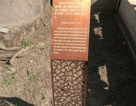 卧龙松是戒台寺十大名松之一,有1000多年的树龄了。主干蜿蜒横生向石栏杆外、树皮斑驳,宛如一条降雨归来的苍龙,爬过石栏,舒适地卧在一块石碑上歇息。碑上所刻的“卧龙松”三个大字是清代恭亲王奕訢手书。
