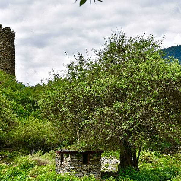 千年古堡矗立,秀巴古堡,非常美的风景,百年野桃簇拥