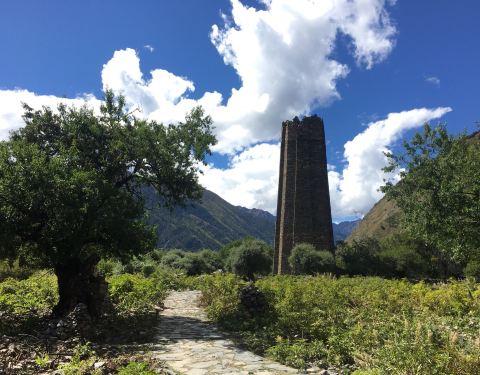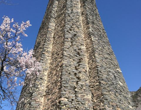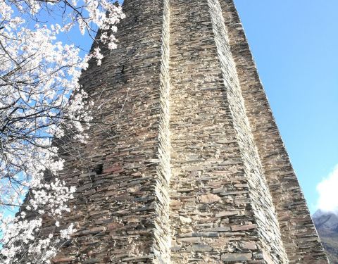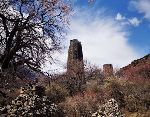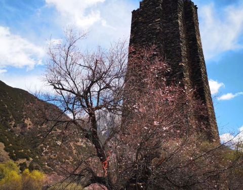 千年古堡矗立,秀巴古堡,非常美的风景,百年野桃簇拥。断壁残垣间的秀巴古堡群在蓝天白云映衬下熠熠生辉又显得异常孤独,不错哦!
