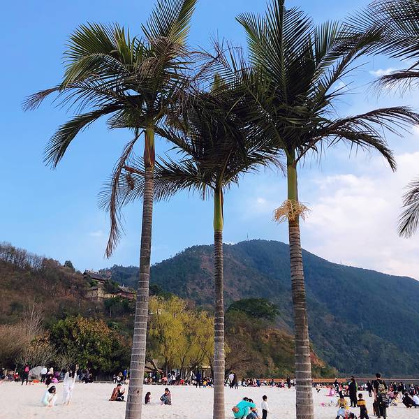 沙滩上的几棵椰子树,让人恍惚间在三亚海边度假🤪 沙滩上的沙很舒服,小曾玩欢了,各种造。 太阳在跟我们躲猫猫,一会进去一会出来,有点凉飕飕,不过从云层里时隐时现倒成就了一副好景色🌤有点凉了,加上老曾肠胃不适,打道回府。 回核桃村的摆渡车🎫价每人💰10,回去的路上邂逅了夕阳🌇,太美了!可惜车速太快,没拍得下来。 到了核桃村,坐106🚌票价每人💰3.5前往月色风情小镇,民宿酒店就在附近,还是很方便。 回去就近选了一家土菜馆进食(早上吃了米粉到现在才吃😅一路上零食水果不断也就不觉得饿,不过老曾的肚子痛怕也是这个原因,还是要规律吃饭才行哦!)