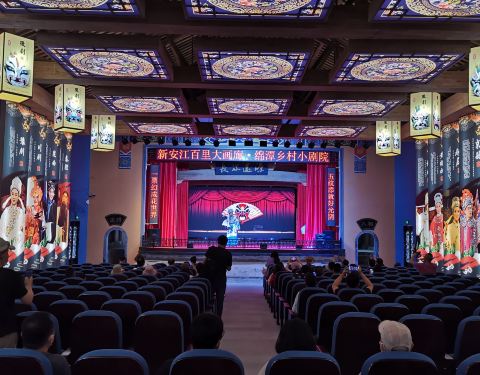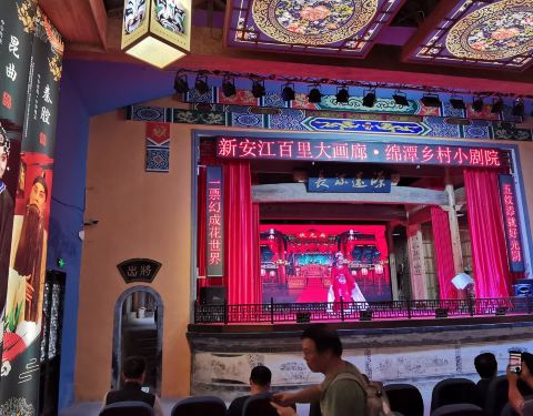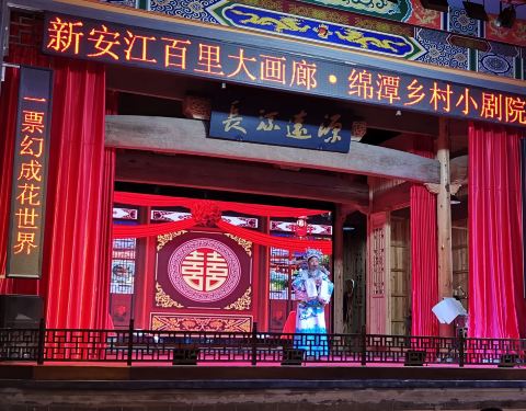 绵潭村,新安江山水画廊水上游线的一个组成游览内容。从深渡镇游船码头行驶约二十分钟,及停靠在有水边牌坊作标志的邻水村落,按游程安排主要是进入一个小剧院观看当地村民的戏曲演出,时常十五分钟。