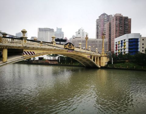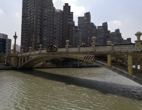 上海苏州河上的一座桥梁,连接了苏州河两岸的居民,方便了老百姓的生活和工作。只是一种人行桥梁,外观有点像中国的传统。让人感觉与河沿岸的自然风光并不太吻合。