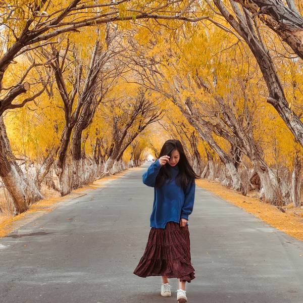 塔合曼乡位于塔什库尔干塔吉克自治县县城以北32公里处,世界屋脊慕士塔格峰脚下。塔合曼乡也是塔县最大的塔吉克族人村落之一,这里有著名的塔合曼湿地,除了孕育肥沃的黑土地,更成就了闻名的帕米尔高原牛羊。在塔合曼乡,有一条鲜为人知的乡间小道,一到秋天,路旁的树叶全都黄了,密密麻麻树叶交叉,覆盖整个路面,非常壮观。 来到这里的时候,瞬间被眼前的这片金黄所震撼了,是谁把秋天的颜色洒落在这里了?一眼看不到尽头的乡间小路,全是金黄色的一片,置身这里就像在“黄金隧道”里穿行,可快乐了,而隧道的尽头,我想是世外桃源的样子吧!漫步在“黄金隧道”,从喧嚣的城市来到这里,仿佛进入了童话中的仙境,看着日光照耀下的金黄树叶,循着风的方向,空气里每一寸都弥漫着秋天的气息。我想我是最喜欢秋天的,它是收获的季节,它伤感但浪漫丰富,它安静但绚丽多彩...那秋风轻盈的吹来,更是一种凉爽的惬意,飘落在耳边的树叶,更是一种无声的乐章,奏出季节更替的轨迹,这一切的一切,都是秋天的最美好。 南疆的秋天,就是如此恣意浓烈,就是如此挥毫泼墨,大片大片的金黄,满足你对秋天的美好想象。塔合曼湿地四面环山,地势较低,无数的山泉汇集于此,形成了塔什库尔干最大的草场基地,也是塔合曼乡牧民赖以生存的优质牧场。在这条乡间小路旁边就是一大片的草场,看见牧民在放羊,我们也忍不住过去和羊群玩在一起。曾梦想自己有一个牧场在雪山脚下,辽阔的大草原,每天和雪山对望,和羊儿为伴,过着不问世事的”神仙生活“。 可是梦想始终是梦想,不知道什么时候会在我身上实现?但是,自己还没有实现的梦想,可以在别人的理想生活里过一把瘾,也是可以的!太向往雪山下的牧场生活,羊儿声唤醒,伴星河入睡。来到这里,看着若隐若现的雪山,看着黏在身旁的狗儿,周围成群的牛羊,金黄色的树木,就像置身在童话仙境里。看着这一切,所有坏情绪都会瞬间被治愈。这些曾在梦里出现的画面,一不小心在塔合曼乡实现了!【小tips】 这里是乡间小道,人虽然不多,但会有来往的车辆通过,拍照时候要切记切记切记注意安全。 除了这一条看不到尽头的隧道,旁边也有一条完全没有车辆通过的隧道,在这里你可以随意拍,既不影响车辆通过,也可以拍出自己喜欢的照片。
