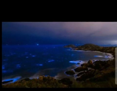 随着波浪,蓝光在海面上发散开来,放眼望去,海岸线荧光氤氲,犹如电影中异域仙境