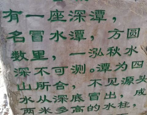 冒水潭是安顺天星桥景区里面的一个景点,临近银链坠潭瀑布。 冒水潭处有一石碑把冒水潭描给得很真实:“谷底有一座深潭,名冒水潭,方园数里,一泓秋水,深不可测。潭为四山所含,不见源头,水从深底冒出,成两米多高的水柱,又静静淯落潭面,如夜空中的礼花。”,看了这个描述,你是否心里痒痒的,想一睹为快呀? 图片中看不出水柱,更看不出两米多高,因为距离有点远,想知道冒水潭究竟如何?亲自走一趟不就行了!