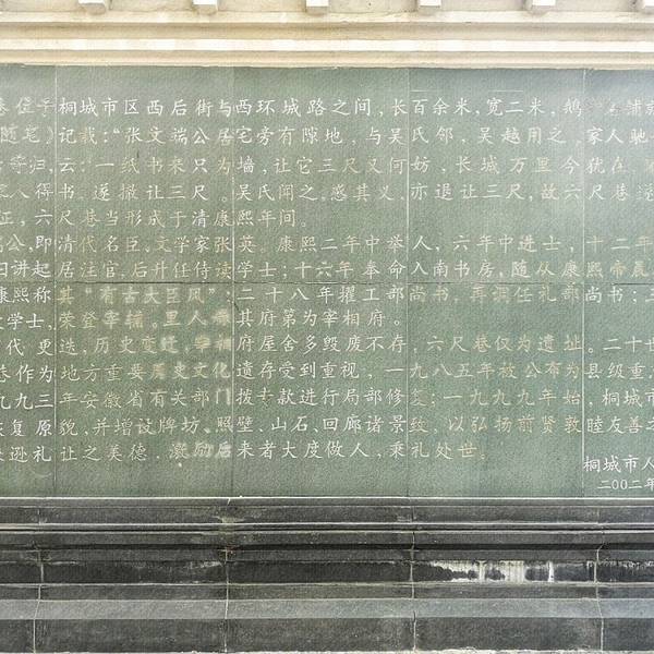 在中国古代传说中,不乏有歌颂“礼让”精神的故事,除孔融让梨之外,最著名的当属六尺巷的故事了。这个故事很多人听说过,但是真正去过六尺巷的人可能很少,它名扬天下,传世几百年,因清代文华殿大学士张英那封信而闻名。 六尺巷,位于安徽省桐城市的西南一隅,它原本是一条极为普通的小巷子,但因为它有一个仁义礼让的故事而流传千古。 据姚永朴《旧闻随笔》、《桐城县志略》载:六尺巷建成于清朝康熙年间(1662年—1722年),全长只有100米,宽度2米,张文端公(清康熙文华殿大学士张英)居宅旁有隙地,与吴氏邻,吴氏越用之。 家人驰书于都,公批诗于后寄归,云:“一纸书来只为墙,让他三尺又何妨。长城万里今犹在,不见当年秦始皇”。家人得书,遂撤让三尺,吴氏闻之感其义,亦退让三尺,故六尺巷遂以为名焉。 在安徽旅行,今天特地路过桐城,走进六尺巷,感受一下古老的中华文化。漫步在六尺巷,在小巷前就立着一块牌坊,上面镌刻着“礼让”二字。巷子很短,但走过仿佛跨过整个人生,阵阵微风吹过,两旁树叶哗哗作响,不由得让你感受到那种古老历史的气息,甚是美妙。 “千里修书只为墙,让他三尺又何妨。万里长城今犹在,不见当年秦始皇。”这个发生在清代的两家人之间的小故事,虽然不是什么历史上的重大事件,但却对世人有着很深刻的警醒之意,大度做人,克己处事,桐城六尺巷的历史典故,是一把人生的尺子,更是一种修养境地的隐喻!⚖️📐📏 小贴士: 六尺巷 地址 : 安徽省安庆市桐城市文城西路68号。 门票:免费。 开放时间:全天候开放。 推荐指数:★★★★ 游玩攻略: 1,2007年4月,桐城文庙-六尺巷成为国家3A级旅游景区,不过县级市桐城并不是安徽省旅游城市,如果路过可以去看看,但专程去游玩就没有必要,因为游览时间很短。 2,历史上六尺巷故事有很多版本,最著名的是清朝文华殿大学士张英的故事。 3,六尺巷主要景点有:懿德流芳牌坊、太湖石、六尺巷、礼让牌坊等。 4,六尺巷周边景点有桐城文庙,南大街历史文化街区,孔城镇,北大街,东大街,胜利街等,可以结合时间游玩。