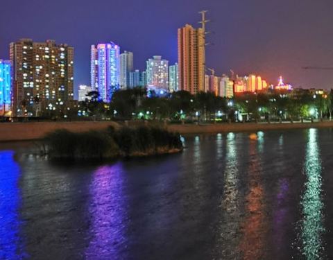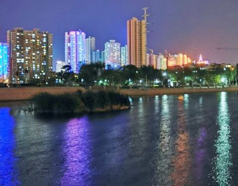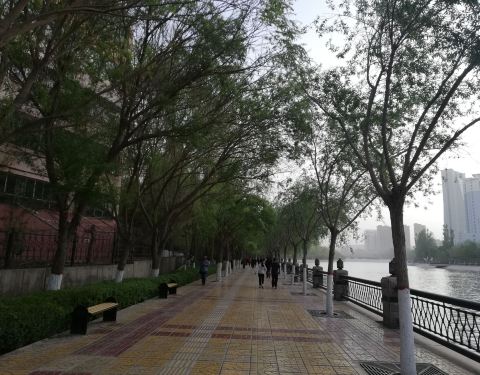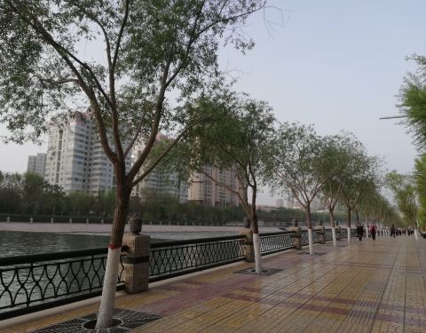 库尔勒市天鹅河景区是凭借孔雀河景观带而建,是市民晨练和夜晚散步的好地方,延河两边景色宜人,小广场上市民可跳舞健身,库尔勒市很美的西域边城。