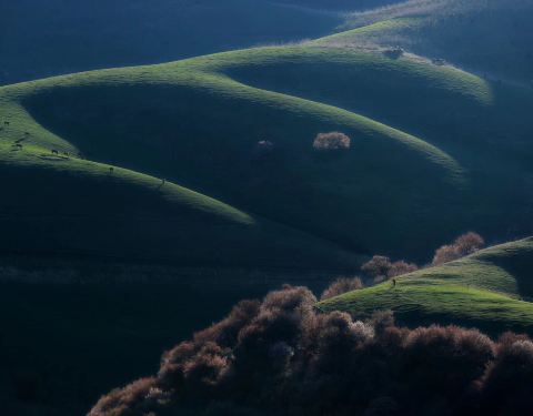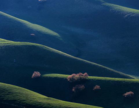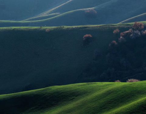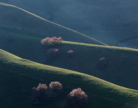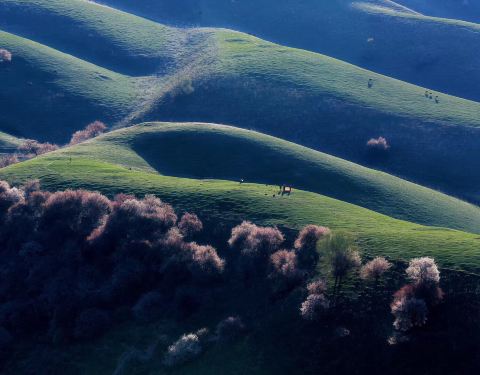 新源吐尔根杏花如期而至,整个杏花沟的野杏花开得漫山遍野,粉粉的杏花在光影和山体间的线条补托下,...
