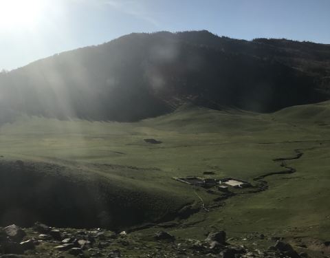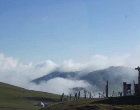 是当地哈萨克牧民的夏季牧场,牛羊、毡包遍地,此处海拔比较高,清晨时分可以看到翻腾的云海,景色壮丽无比