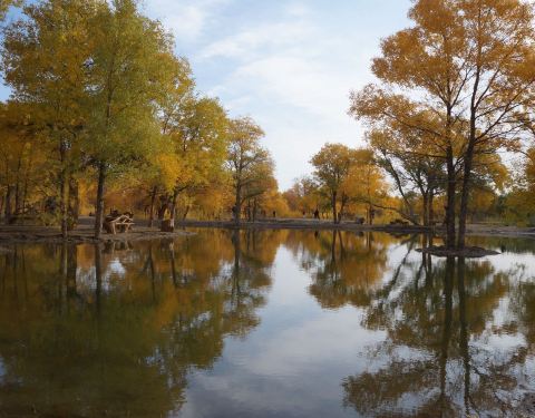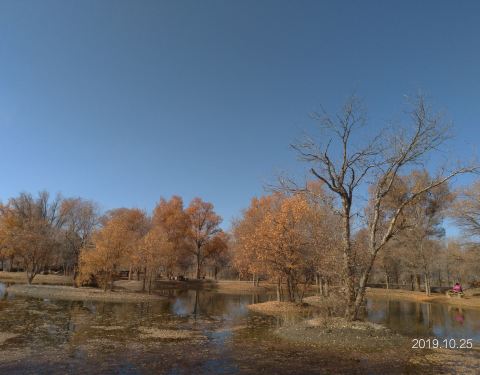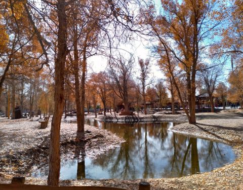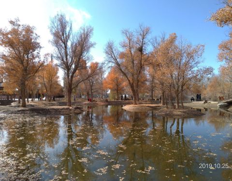 在金塔胡陽林景區內,最吸引人眼球的主要景奌,所有公佈的最美畫面几乎都出自於这,倒影是一絕,一群鴨子也是^^,那些叫声讓湖辺多了生氣~