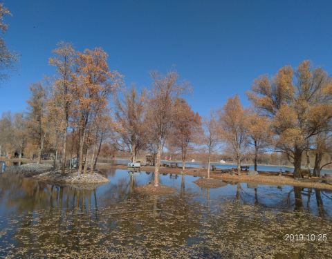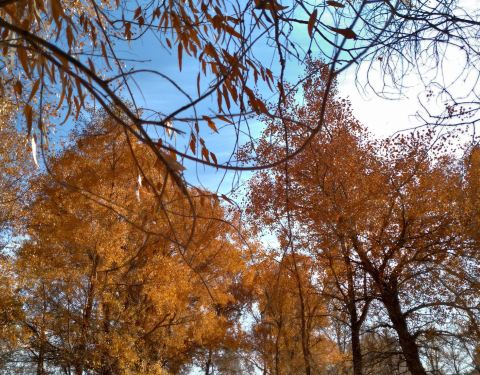...柳、白杨,胡杨林在水中倒影,金黄色,蓝色,浅绿色,形成了一幅美丽的画卷,在这里拍照真的是美呆了