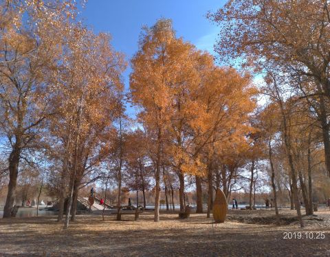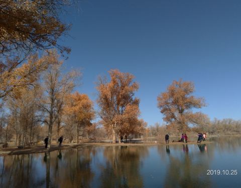 金波湖是金塔沙漠胡杨林景区的核心游览区,这里也是景区环保车的终点站,也是最漂亮的地方。金波湖湖区面积较大,笔直的树干倒映在湖面上,湖面上有小鸭子、桥,环湖的栈道,在湖的旁边密布着的胡杨、红柳、白杨...
