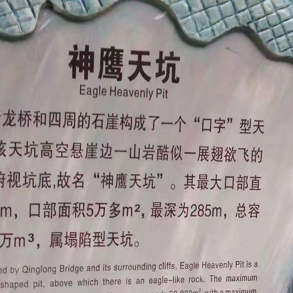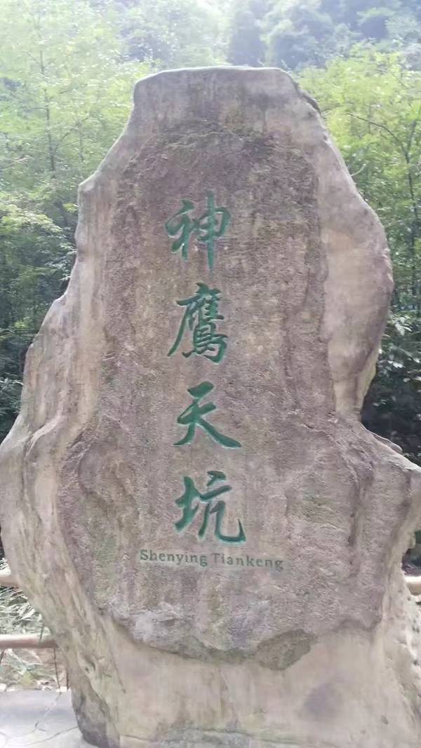 就不得不赞叹大自然造物的神奇,从下往上看,真的像是一只神鹰盘据岩石,仰天长啸,神鹰炯炯有神的姿...来到神鹰天坑,就不得不赞叹大自然造物的神奇,从下往上看,真的像是一只神鹰盘据岩石,仰天长啸,神鹰炯炯有神的姿态,让人敬畏又有期盼的神情。