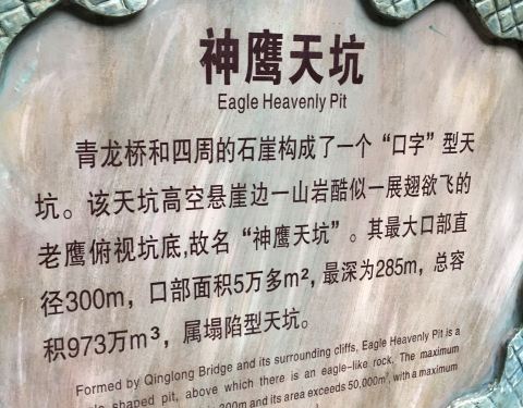 青龙桥和四周的石崖构成一个口字形天坑,该天坑高空悬崖边一个山岩酷似一个正在展翅高飞的雄鹰,所以因此得名神鹰天坑。其最大不直径300米,口部面积五万多平方米,最深处可达285米,总面积973万平方米。