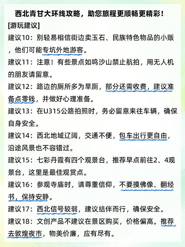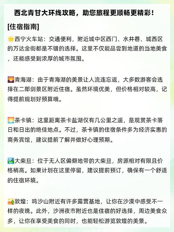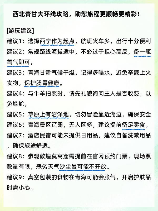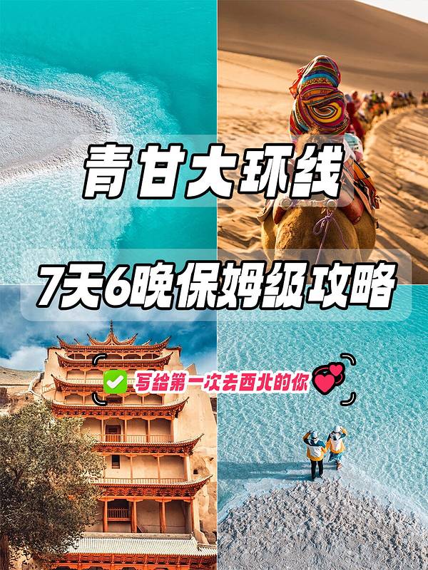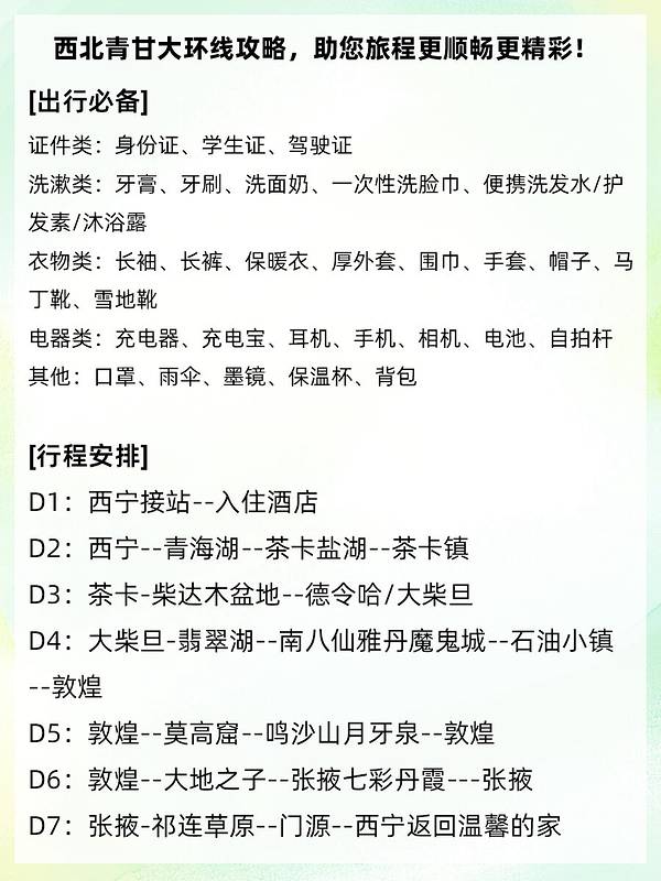 西北懒人版旅游攻略☑️看这一篇就够了‼️||💡西北真的不适合说走就走,一定要提前做好攻略才能玩得更开心哦,西北旅游懒人版攻略来啦!让你省心又省钱!👀👀 - 🚩2024年西北旅行小贴士 🌄在高海拔地区,头疼、胸闷都是正常反应,切记不要剧烈运动,慢慢适应就好。 👓青海的阳光特别刺眼,特别是去沙漠的时候,一定要带上墨镜,保护眼睛不受伤害。 📷在塔尔寺等宗教场所,请尊重信仰,不要随意拍摄,尤其是大殿内,通常都是禁止拍摄的。 🧥西北早晚温差大,记得带上一件抗风外套或羽绒服,保暖第一! 📷如果带了相机,记得带上收纳袋和保鲜袋,防止沙子进入镜头,影响拍摄效果。 🛣️在网红U型公路拍照时,安全永远是第一位的,不要冒险站在马路中间。 - 💸西北省钱小妙招 ✈️想要机票更便宜?试试在周二到周四选择晚班航班,错开高峰期,价格更亲民。 🎫学生证、老人证都是省钱利器!记得带上它们,很多景点都有优惠哦。 🏨住宿方面,提前预定能享受更多优惠,同时多对比几个平台的价格,避免被大数据“杀熟”。 🛍️特产不必在景区买,价格通常偏高。去超市逛逛,种类多又便宜,轻松带回家! - 🧩西北七日游行程规划: ✅D1:出发地--西宁-入住酒店 ✅D2:西宁--青海湖--茶卡盐湖--茶卡镇 ✅D3:茶卡-柴达木盆地--德令哈/大柴旦 ✅D4:大柴旦-翡翠湖--南八仙雅丹魔鬼城--石油小镇--敦煌 ✅D5:敦煌-莫高窟-鸣沙山月牙泉--敦煌 ✅D6:敦煌--大地之子--张掖七彩丹霞---张掖 ✅D7:张掖-祁连草原-门源---西宁返回温馨的家 - ⭕️西北景点介绍 📍青海湖:中国zui大的内陆湖泊,湛蓝的湖水,美不胜收 📍七彩丹霞:甘肃的著名景点,独特的景观美不胜收 📍U型公路:又被称为网红公路,中国版66号公路 📍嘉峪关:天下d一雄关,是古代“丝绸之路”的重要交通要塞 📍马蹄寺:中国佛教宝藏之一,处处都是文化遗产 📍岗什卡雪峰:山峰顶堆积了厚厚的白雪,如同一条玉龙 📍茶卡盐湖:中国的天空之境,盐湖的美景令人惊叹 青甘大环线上的每一处景点都有着其独特的魅力,无论是自然风光还是人文景观,都让人流连忘返。快来踏上这段旅程,亲自感受这些美到窒息的风光吧!🎉🌈
