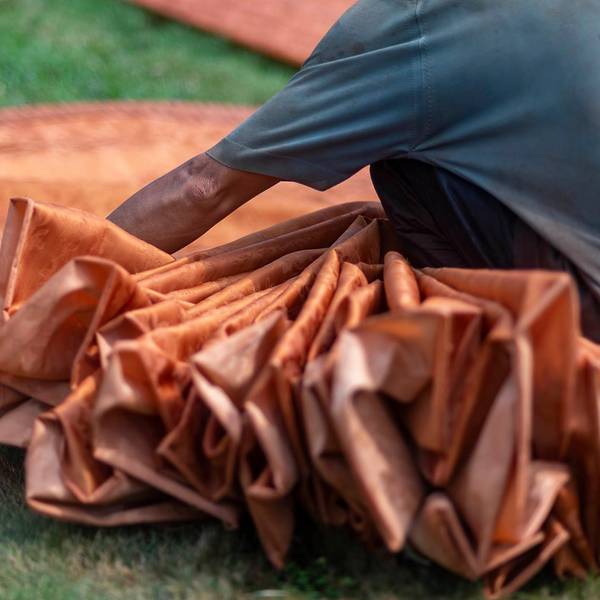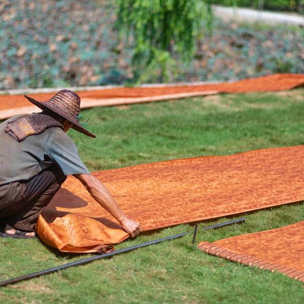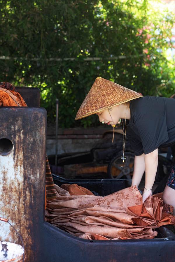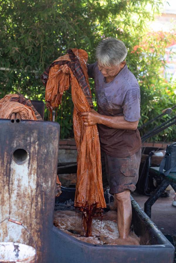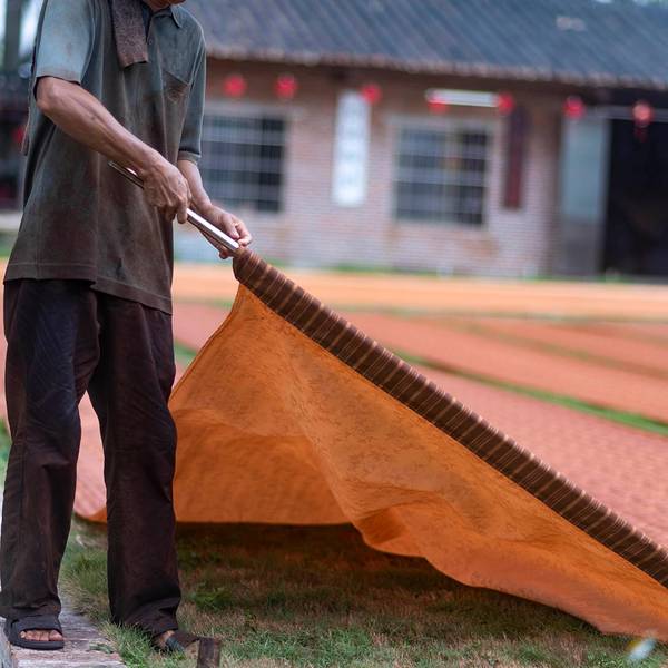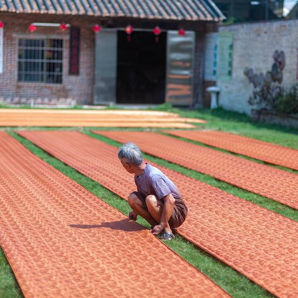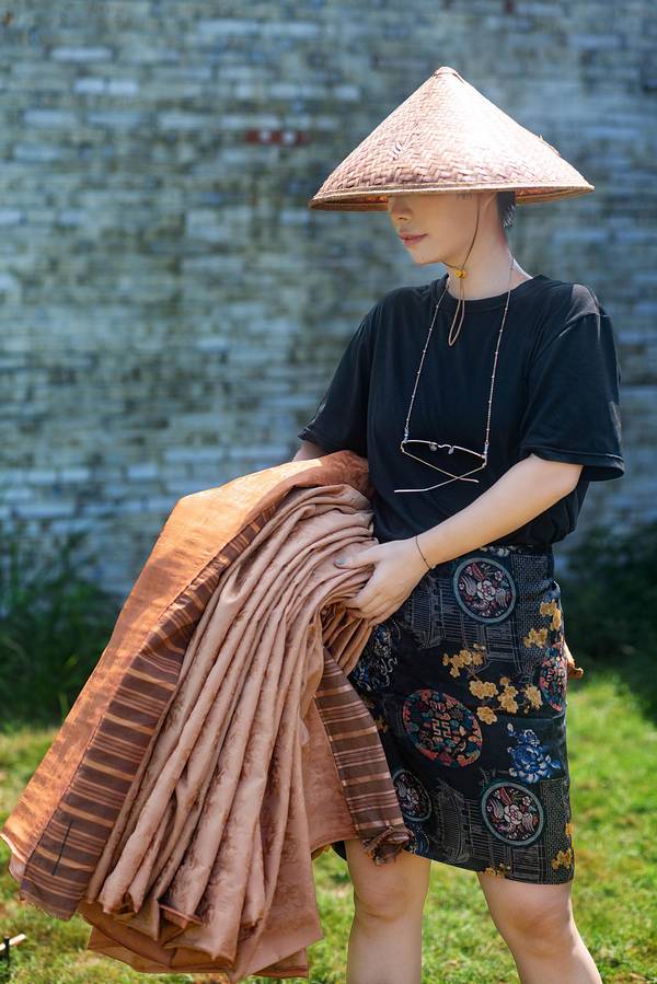 顶着香云纱是什么的大大问号?我走进了香云纱博物馆。人们说香云纱价格贵,是工艺几乎失传的一种丝绸,说起这块薄纱背后的故事也是十分精彩。香云纱是一种天然植物染色丝绸,民国4年,香云纱问世,曾风靡一时。90年代,随着化纤织品的侵入,逐渐代替传统丝织业,香云纱工艺也一度失传20多年。最后是西樵的张家四兄弟组装绞综,恢复了白坯纱生产,并采用自产坯纱成功晒莨出香云纱。香云纱是用薯莨汁浸泡而成,因所制成衣在行动时会沙沙作响,故称“响云沙”,又通过粤语发音相似称“香云纱”。香云纱要用到坯绸和薯莨液,经过浸莨、晒莨、封莨、煮绸,再到过泥、清洗河泥、封莨和摊雾等一系列手工工序,经过反复的工艺,多种配料在丝绸料上产生的化学反应,白坯纱才生成品质优良的香云纱。在这里会发现不少晾晒在地上浸莨过的绸料。如今在香云纱(坯纱)织造技艺传承基地,人们可以走进香云纱背后的工艺流程,观众也能亲手体验制作香云纱。