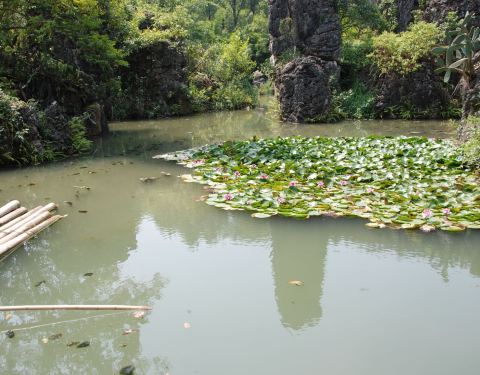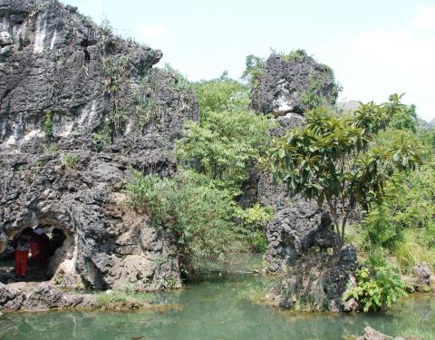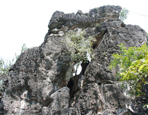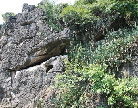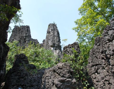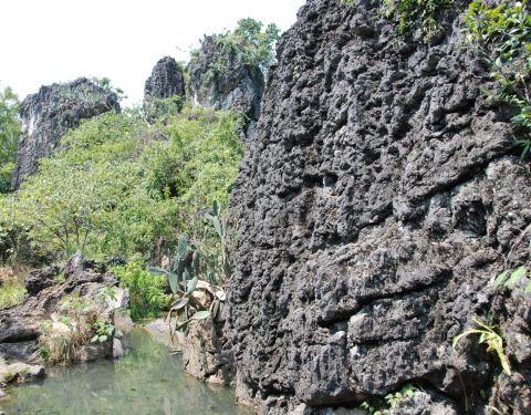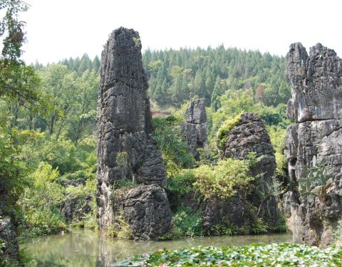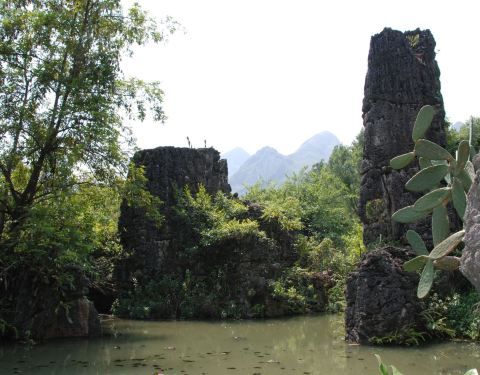长青峡是黄果树七星桥景区一道很靓丽的风景线,在水中有很多干枯的石林,呈现黑褐色,但是上面长满了绿色的仙人掌,形成了美丽的自然景观。