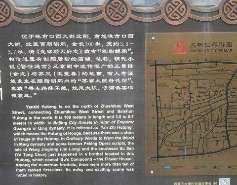 胭脂胡同是北京著名的八大胡同之一,位于北京市珠市口西大街北侧15号。 该胡同南起珠市口西大街,北至百顺胡同,全长100米,宽度在3米至6米之间。 相传旧时这里有制胭粉的店铺,故得名胭脂胡同。如今这里只是一个普通的居民生活小巷子了,不过仍可以依稀感受到旧时北京老胡同的气息。