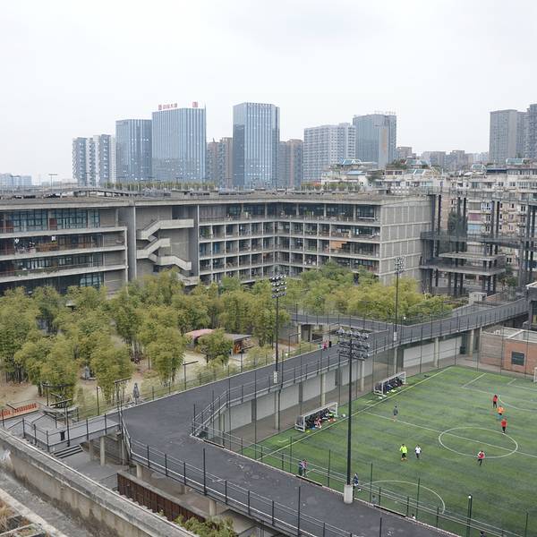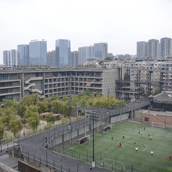 秉承“传统元素的当代表达”建筑理念,大院呈C型半围合布局。1.5公里跑道环绕,与建筑紧密相连。大院通过藻井、天井和林盘景观等传统建筑元素与大院的有机融合,让传统文化、四川地域特色与未来感在这里和谐统一,大院中间是三块足球场,我去的时候有不少人正在踢球,顺着楼梯可以登到顶层俯瞰大院。