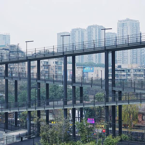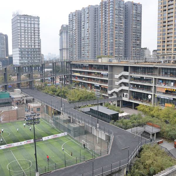 沿着楼梯一直往上,还可以到达大院顶部,欣赏到整个大院的风景。原来成都人真的深谙生活之道成都是一座有着浓厚文化底蕴的城市,同时也散发着现代化的活力。而位于贝森北路一号的西村·贝森大院就是成都传统与现代的完美结合体。贝森大院是成都非常具有特色的一座集运动休闲、文化艺术、时尚创意为一体的...成都是一座有着浓厚文化底蕴的城市,同时也散发着现代化的活力。而位于贝森北路一号的西村·贝森大院就是成都传统与现代的完美结合体。贝森大院是成都非常具有特色的一座集运动休闲、文化艺术、时尚创意为一体的现代化社区,同时也是成都City Walk的好去处。大院为东西长237米、南北长178米的完整街廓,占地约4.2万㎡。呈C形半围合式布局,四面临街,住宅环绕,整个社区成熟又满是特色。据说大院的设计者借鉴了计划经济时代单位集体居住大院的空间原型。并运用现代建筑的设计方法,来打造贝森大院这样一个具有集体主义理想色彩的社区。周围建筑内部为连续的阳台,每家用户都可以共享大院景观。大院以三个足球场为中心,分别是一个7人制足球场和两个5人制足球场。周边是宽阔的C型走道,同时满足休闲和运动需求。这种半围合的建筑架构让人颇具社区安全感,没有那种身居城市的落寞。闲暇时间在走道上散步,看看球场上奔跑的球员,何尝不是生活的一种放松方式。原来成都人真的深谙生活之道。大院同时也很好地结合了成都的本土文化,类似竹子、茶馆这样具有成都本地代表性的物象,都被很好地融入建筑之中。特别是在“竹空间”的打造上,采用“满园竹”,以竹子这种成都平原农耕文化和市井生活的代表性本土植物,也充分呈现大院闲适安逸的成都气质。而整个大院给人最大的印象就是建筑很有设计感,建筑空间的布局不拘泥于格式又恰到好处,随便怎么拍都好看。东西南侧各嵌入了一处外挂楼梯,非常具有设计感,同时为整个空间增添了几处线条美。仔细看你会发现这些楼梯都是用再生材料做成的,兼具美感的同时还很注重环保。沿着楼梯一直往上,还可以到达大院顶部,欣赏到整个大院的风景。三面围合,还有一面则是作为空中跑道。和一般的跑道不同,这里的跑道是立体的,纵横交错,形成一个立体的运动空间。不管是跑道本身还是空中立体跑道这个理念,都是非常具有现代建筑的特色。 展开