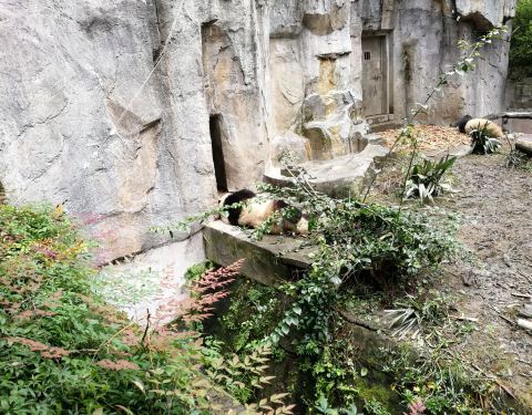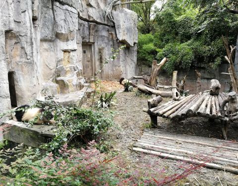 如果是步行参观的话,第一个参观到一号别墅,大熊猫懒懒的躺着。