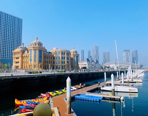 这个码头位于东港音乐喷泉广场东侧。有各种豪华游艇停泊,尤其是帆船游艇进进出出,非常惹人注目。码头岸边是东方水城,那些精美的西洋建筑为码头增添了壮观的底色。