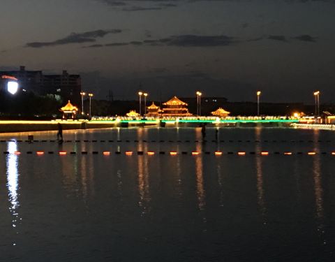 入住敦煌,晚饭后闲来无事,出门溜达溜达,就走到了党河岸边。初见党河,十分惊讶,想不到在荒凉戈壁的的城市,居然有一条大河穿城而过。入夜,党河两岸景观照明更是惊艳,流光溢彩不输江南水乡,恍惚置身秦淮河畔。岸边步道宽阔平整,照明充足,估计游客都奔小吃夜市去了,三三两两悠闲散步的大都是本地人吧,还有一些小孩子在嬉戏玩耍,一片祥和景象。