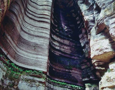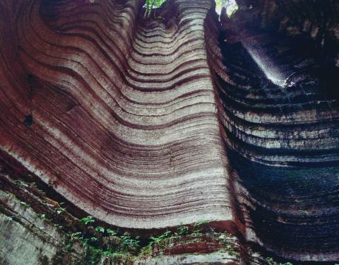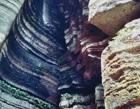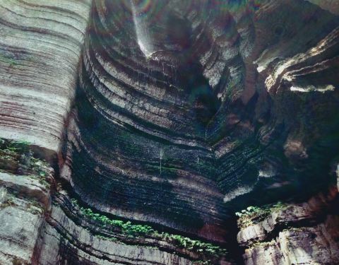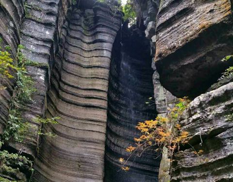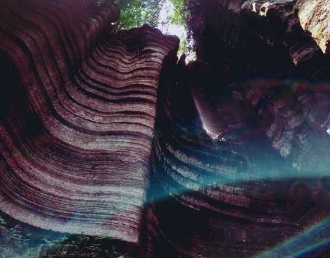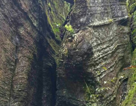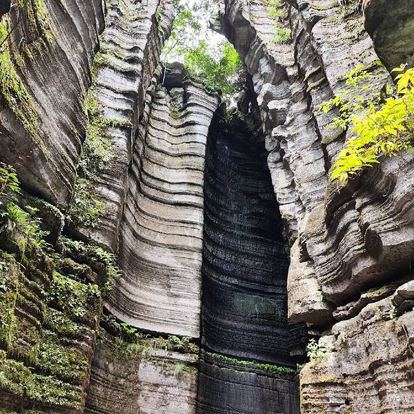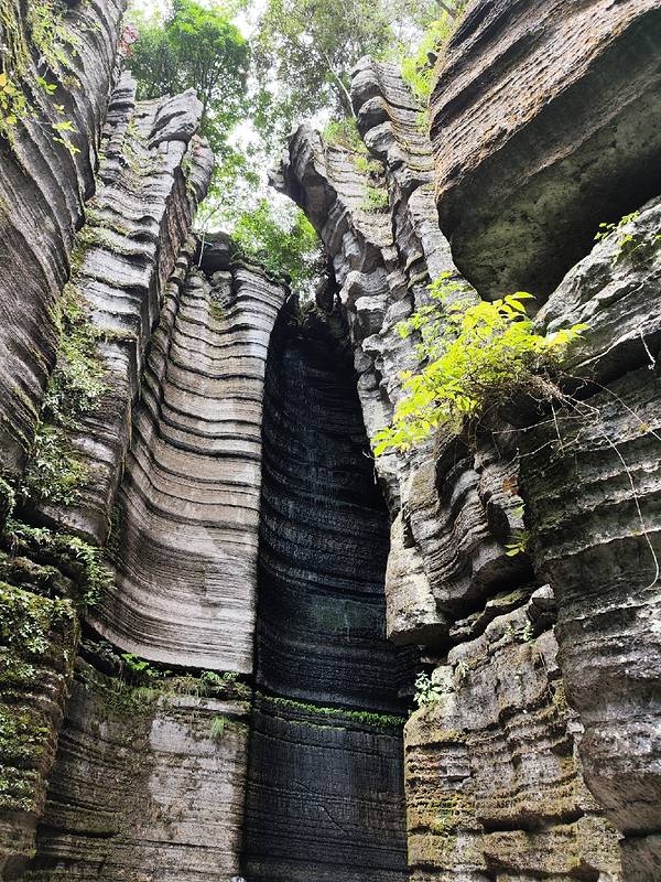 进入九龙汇核心景点,从下向上抬头仰望,在一个垂直的似天井的数十米高的开口处,岩石形成似九龙仰头...