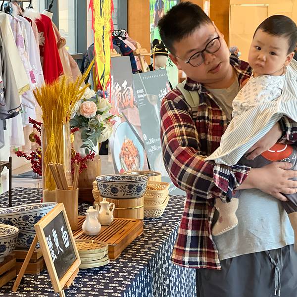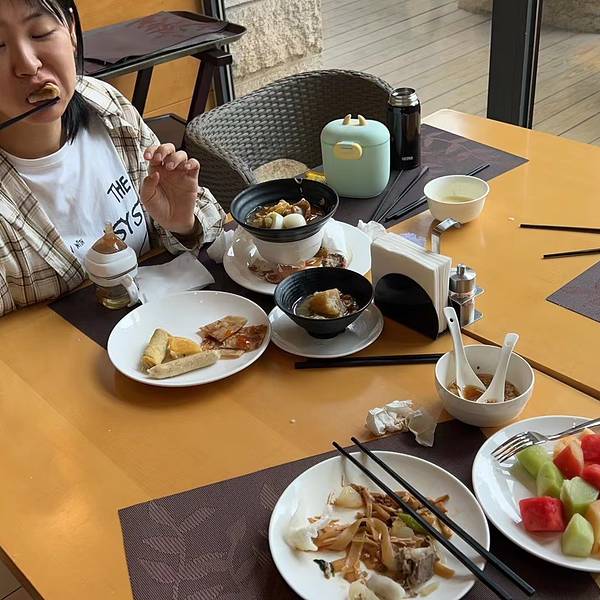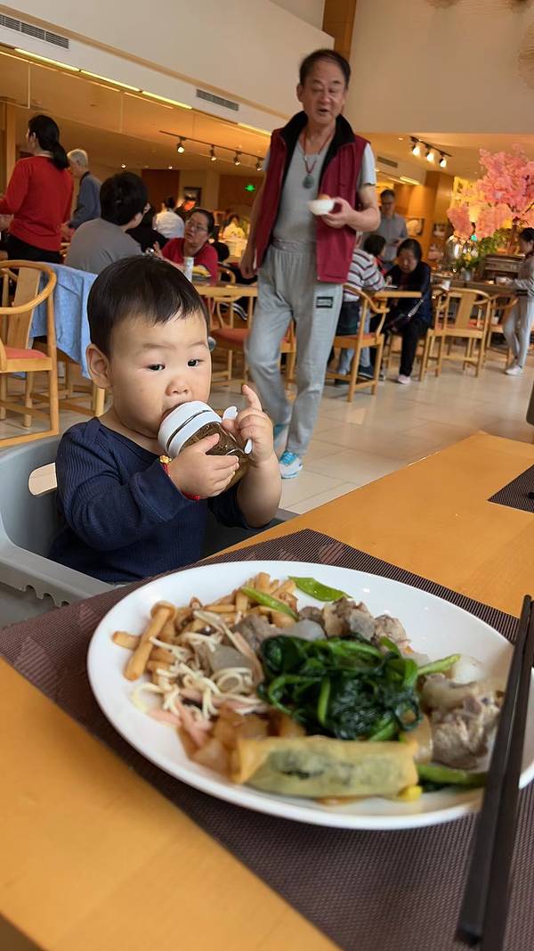 看着我们吃也想吃,刚好酒店有白粥,白煮蛋,给你吃点吧,后面的爷爷说我们真乖吃完早饭溜达溜达
